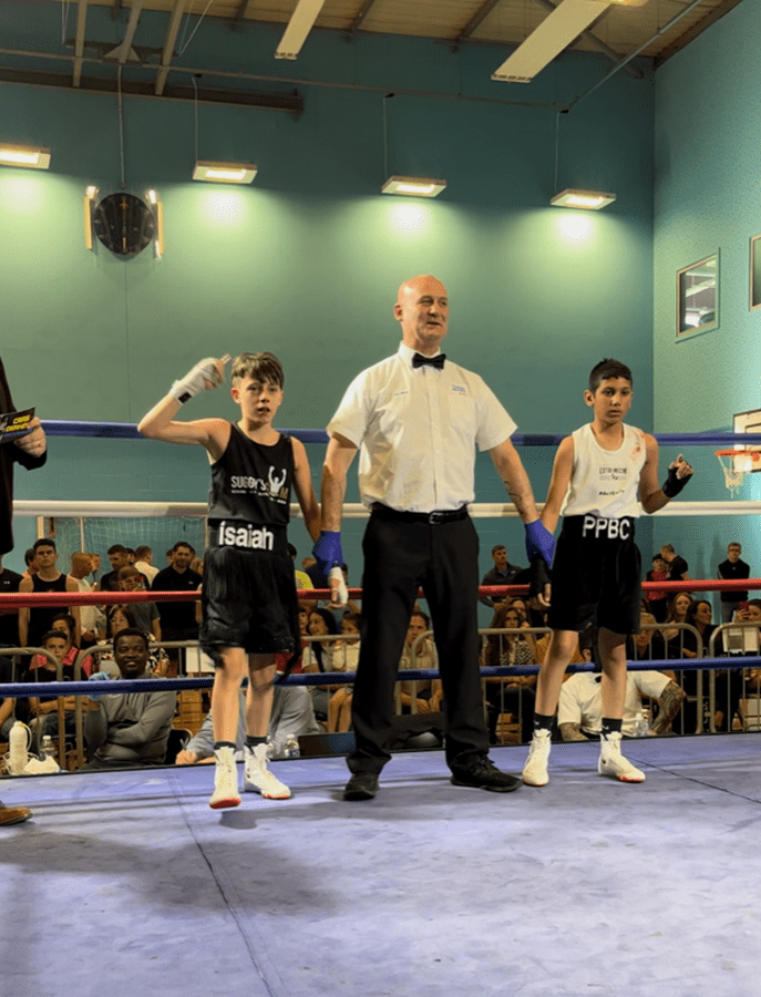 First up for the home team was 12-year-old Isaiah Francis, boxing Peterborough Police Boxing Club’s Musa Ahmed at -37kg, a bout that ended in a unanimous win for Isaiah.