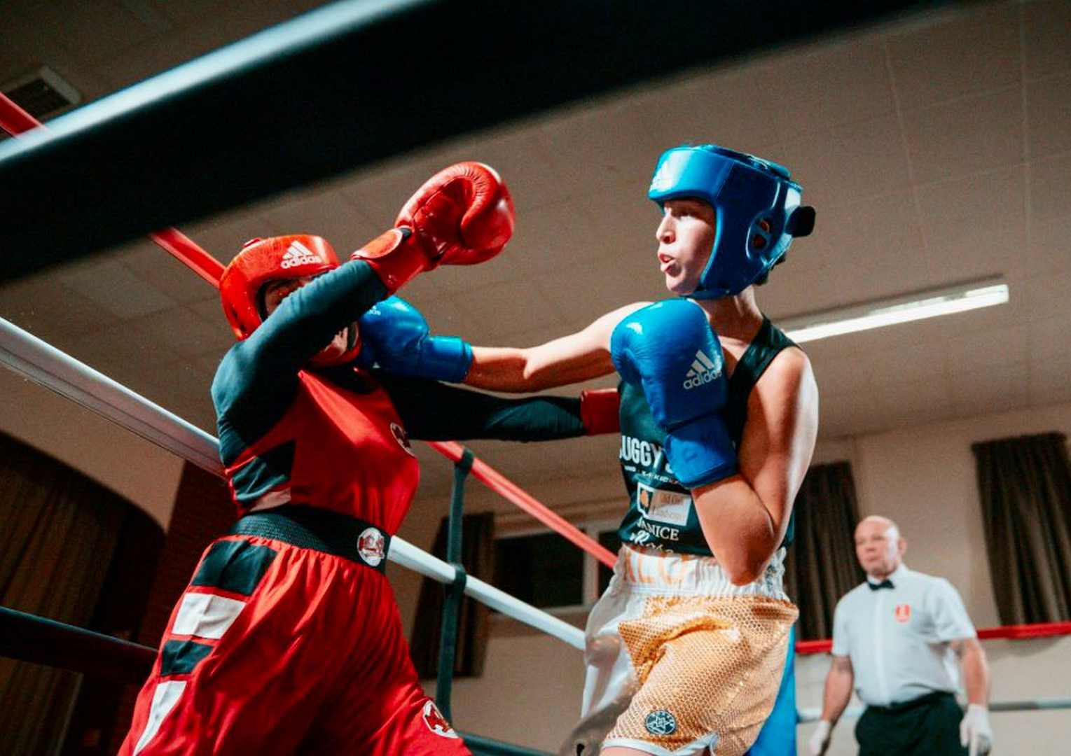 “Next up was Lennon Hage, aged 15, looking for his first win in a while and OMG did he make sure he got his hand raised!” said Dean. “After a cagey first round where both boxers were getting their distance and rhythm, Lennon stunned Braunstone Golden Gloves’ Jack Sharp with a combination of punches. He didn’t let him settle, landing some really big shots to body and head that left the referee in no doubt and the contest was waved off in the very first round.”