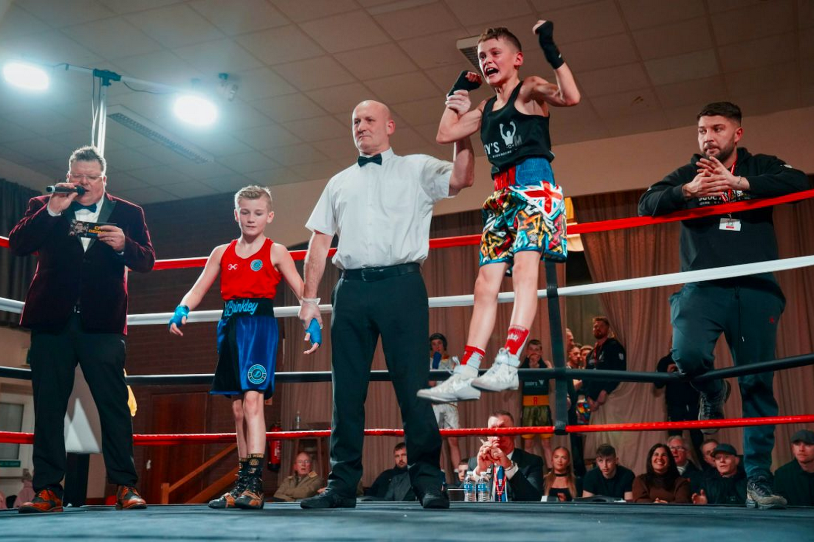 The show began with 13-year-old Riley Scaife, who showed some great skills against a strong boxer in Patrick McCann from City of Leicester Lightning. “Skills bouts are great way to get the boxers used to boxing in front of people and not getting hurt as the emphasis is on skill and both boys got their hands raised at the end of this one,” said Dean.