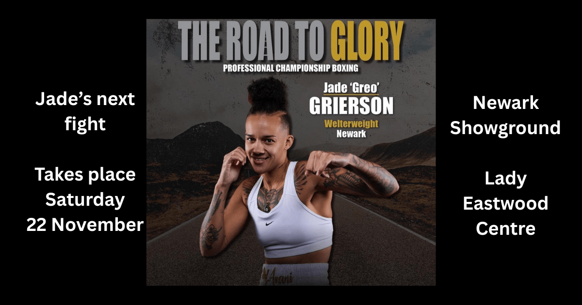 Not long now till Jade ‘Greo’ Grierson will be back in the ring on The Road To Glory for her 8th pro fight, presented by Carl Greaves Promotions in association with Suggy’s Gym’s Dean Sugden at the Newark Showground Lady Eastwood Centre on Saturday 22 November.